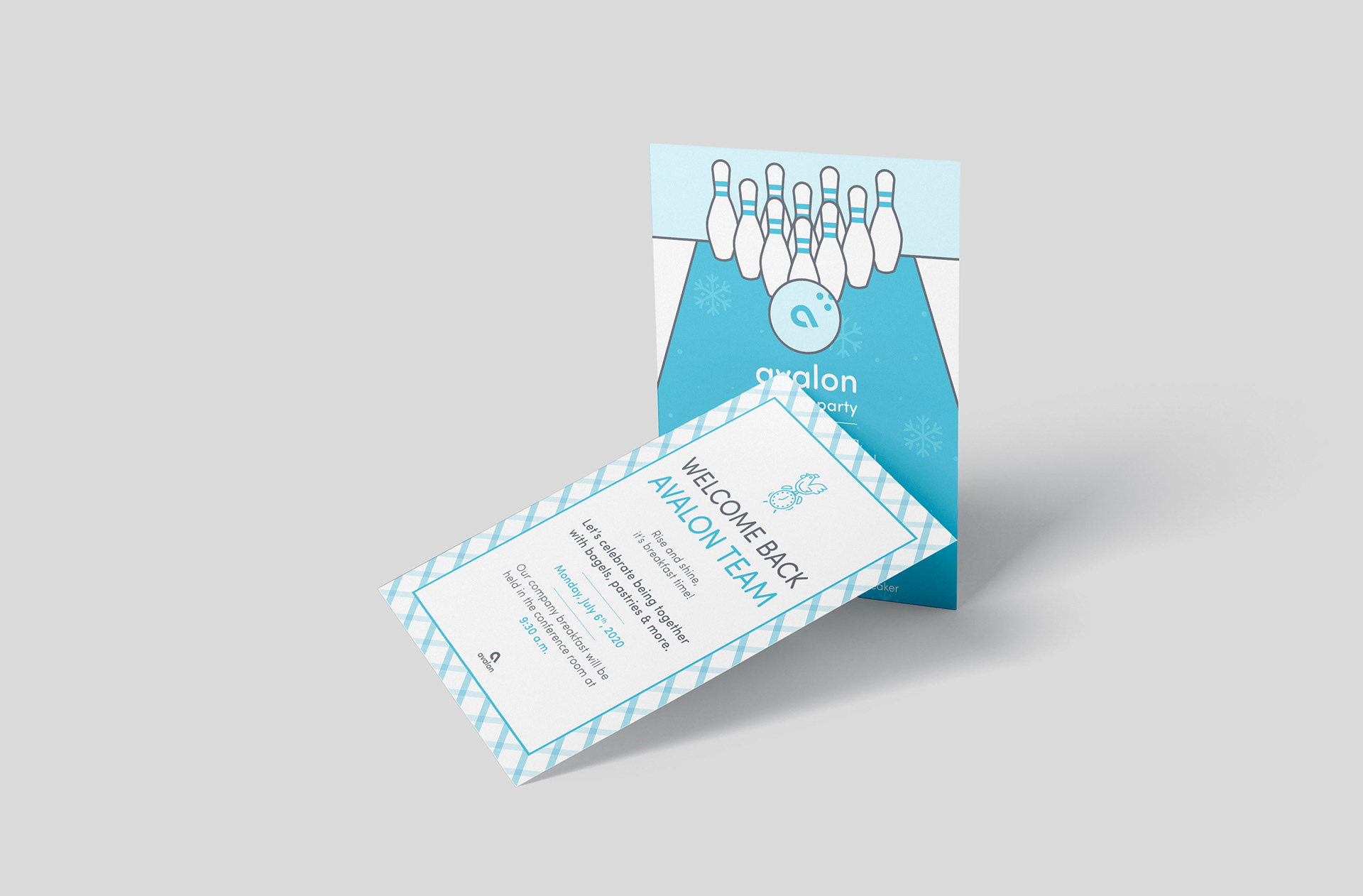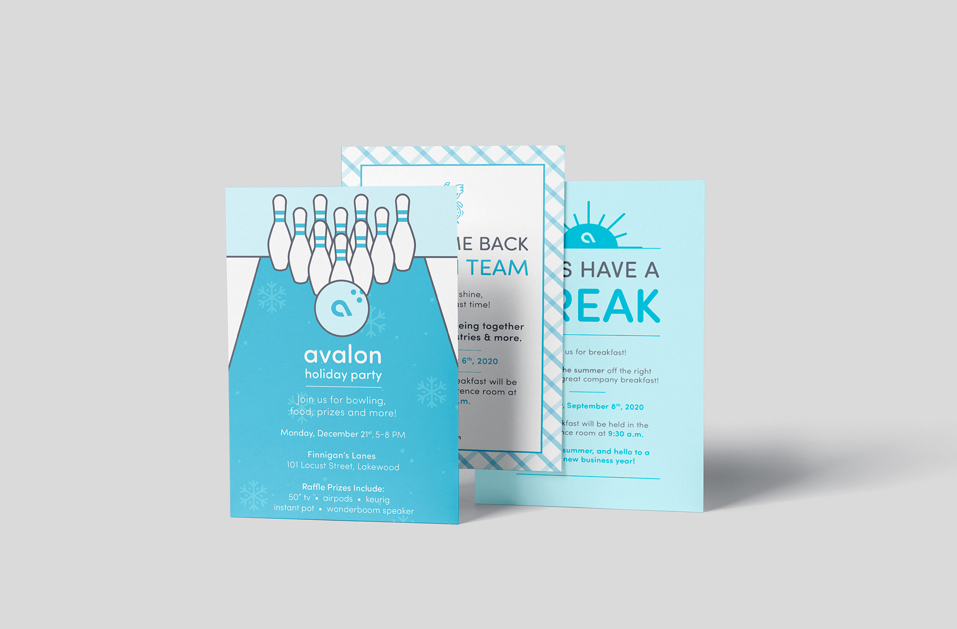 A collection of invitations created for various company events held at or for Avalon as a whole. Each postcard follows brand aesthetic and guidelines.